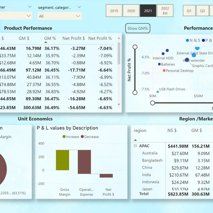 This view shows key values in different categories. On the Ribbon Chart, we can see the market share of key PC sellers between 2018 and 2022. We can also track the profit of the company according to various criteria.