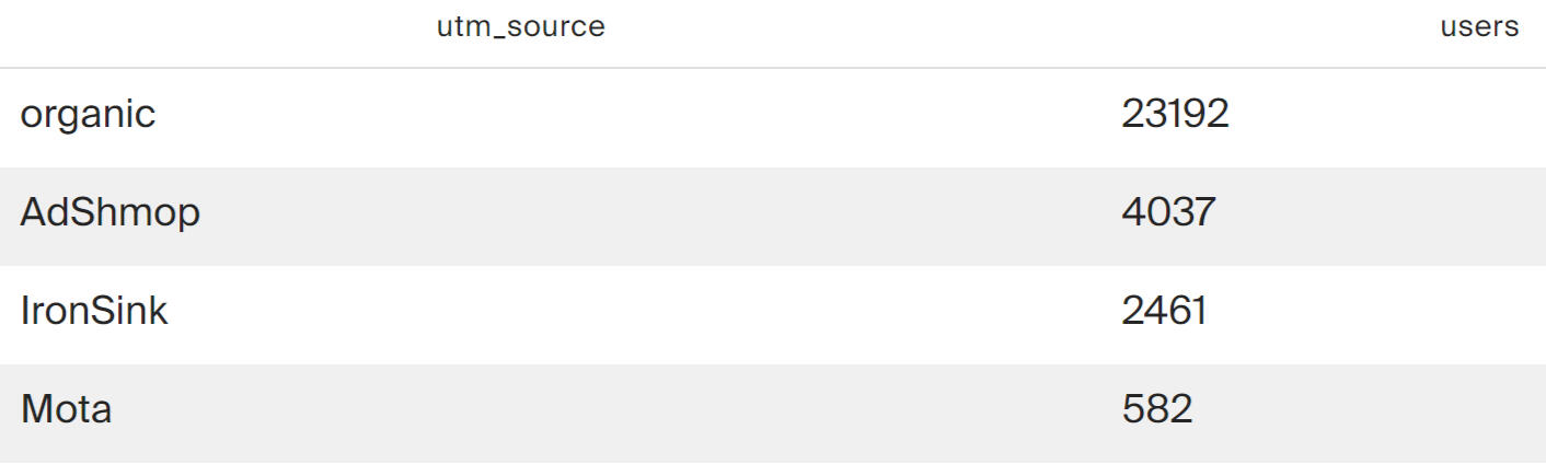 The query results show that most active users were not attracted by advertising sources, but came themselves (organic channel). Among the advertising sources, AdShmop attracted the most attention.