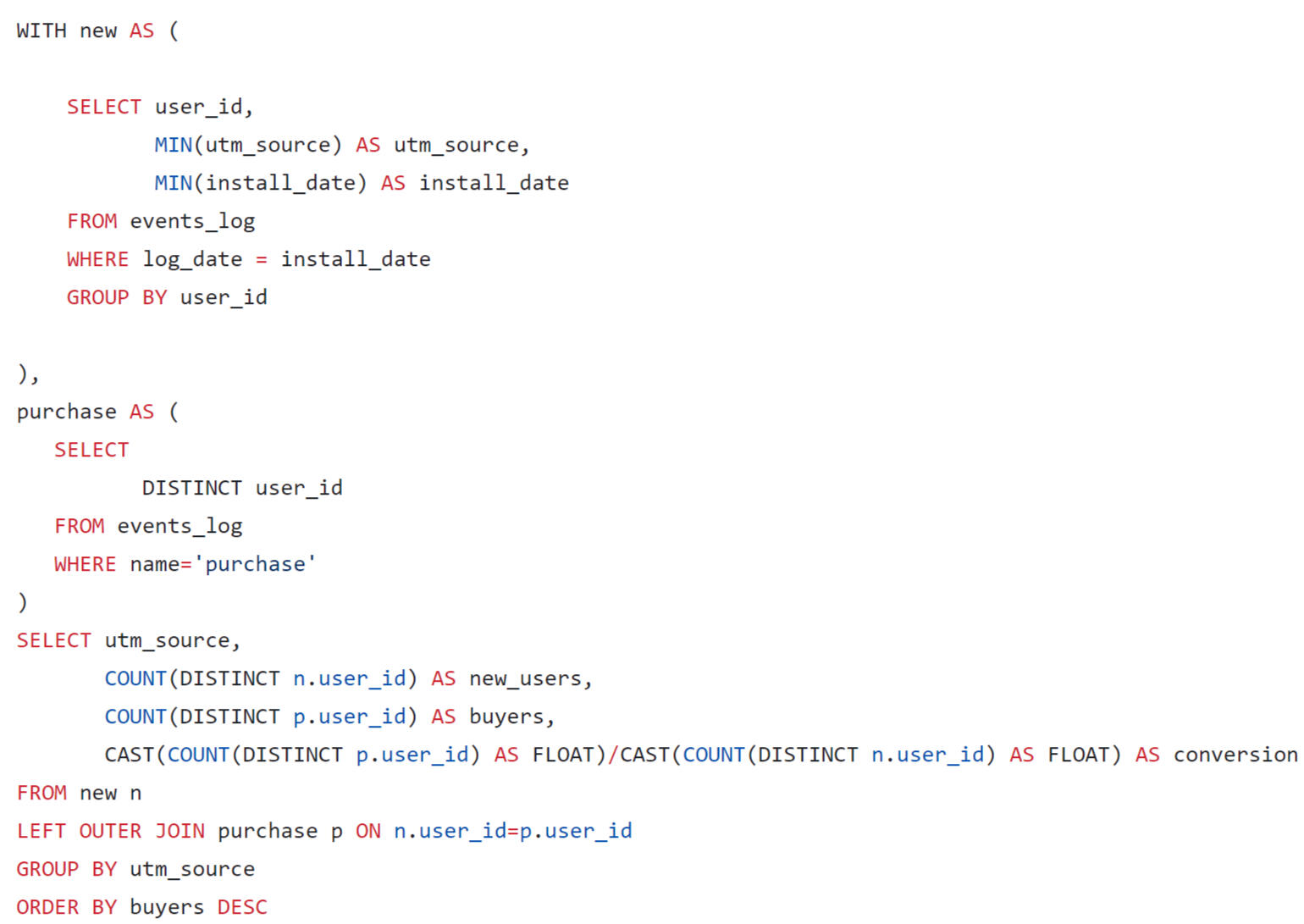 The previous query showed that Mota is an outsider in terms of the absolute number of attracted users. This channel is inferior to everyone except organic in terms of conversion. And the conversion leader is IronSink.