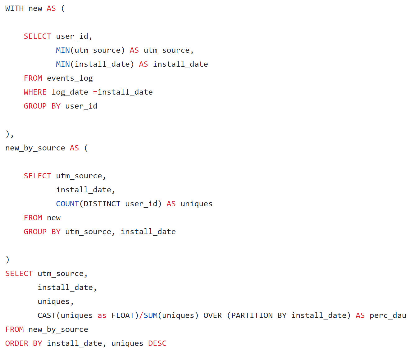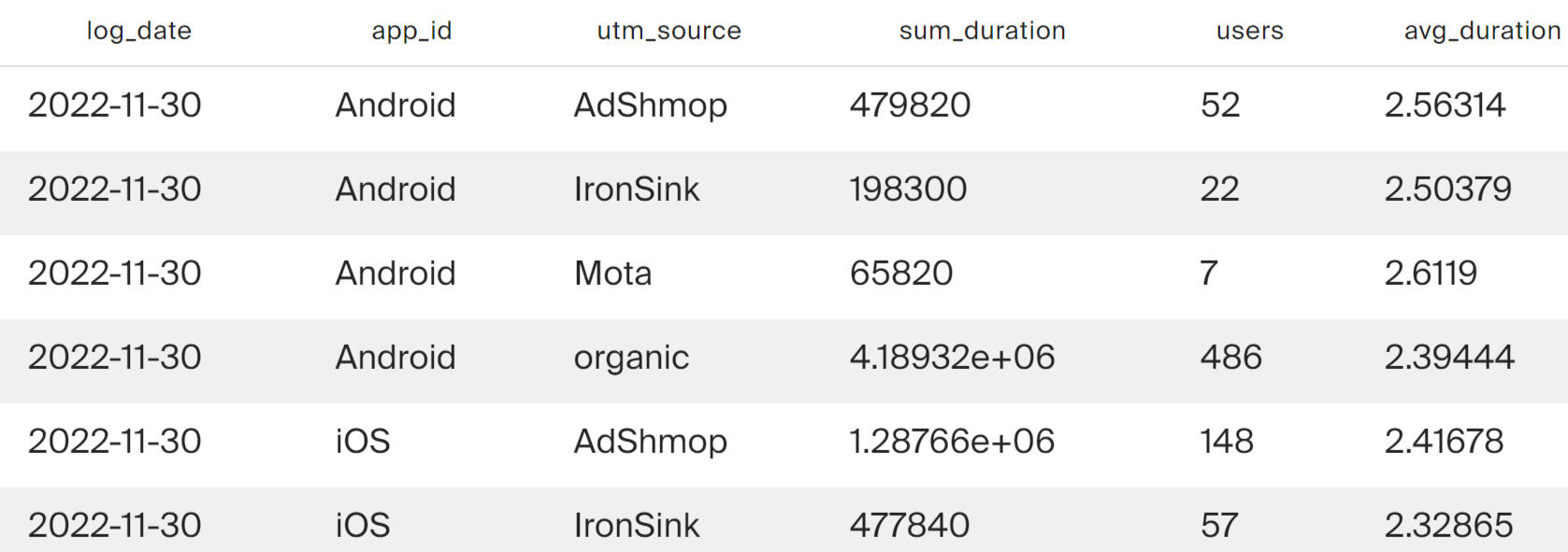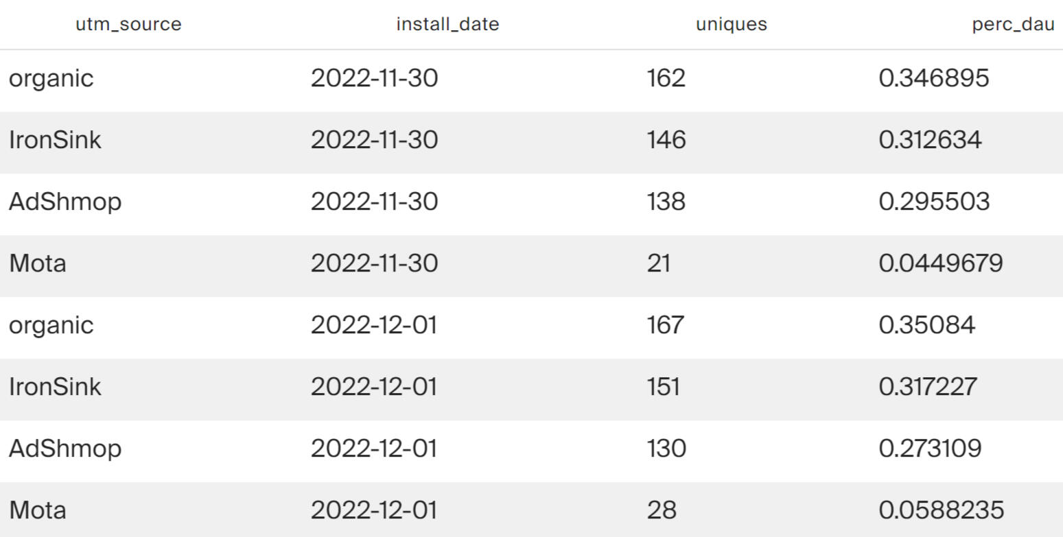 The query result shows that every day each of the channels - organic, IronSink and AdShmop - attracts about 30% of new users each. An outsider in attracting new users is the Mota advertising network.