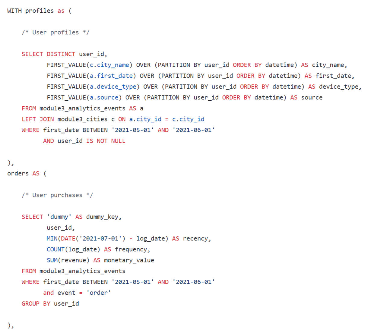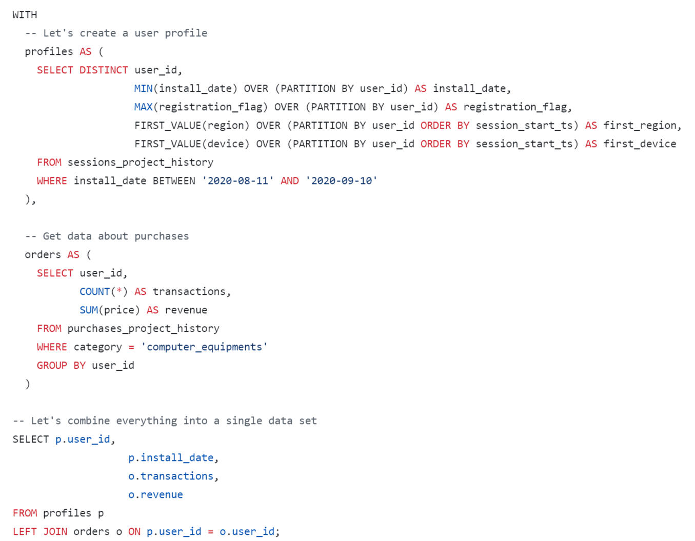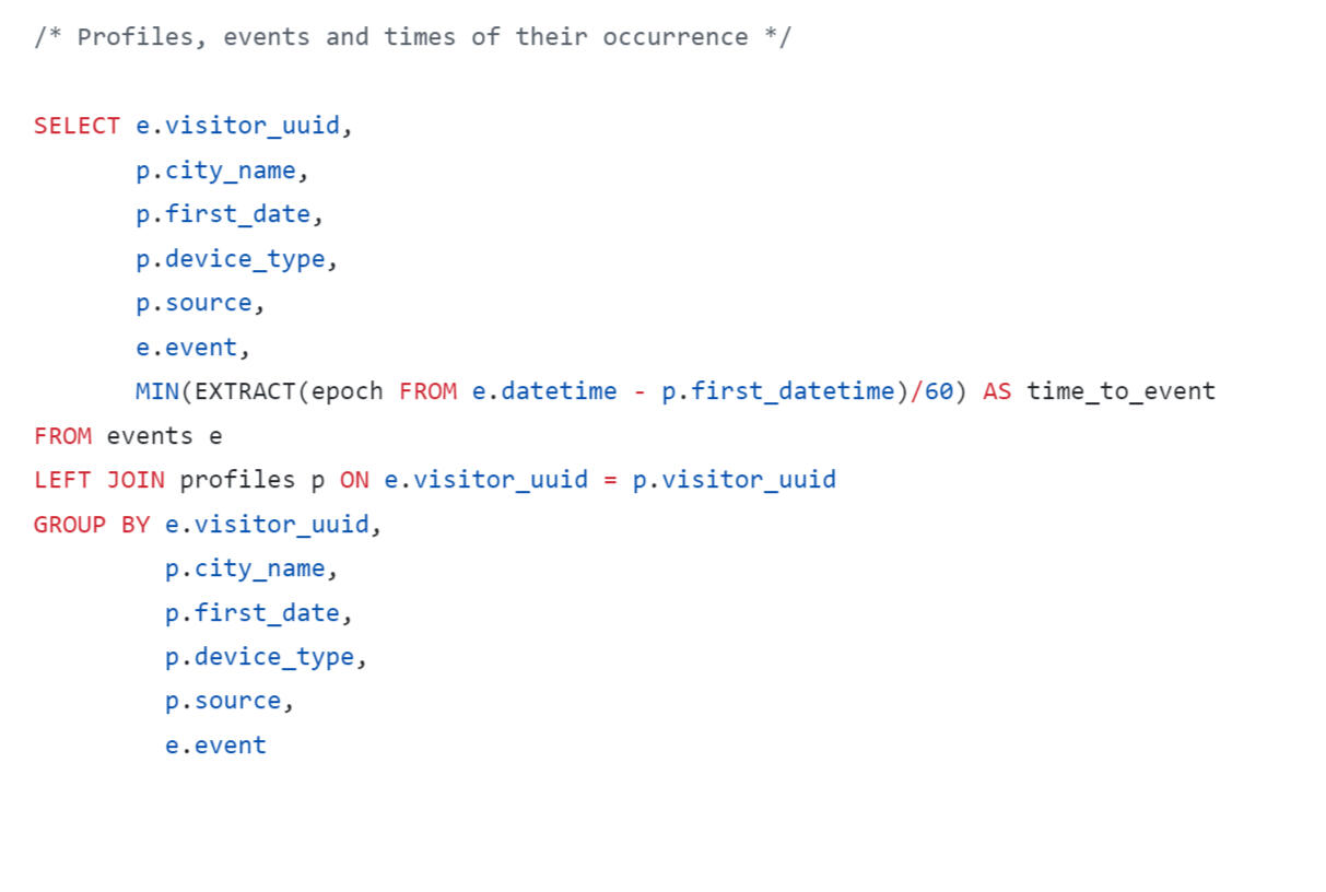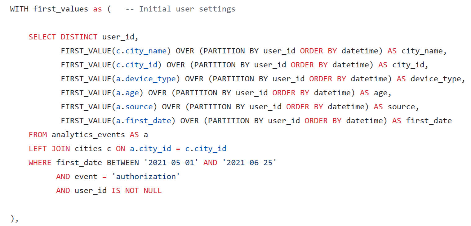 A query was written using SQL to estimate the LTV for the dashboard. When forming a request, you need to consider that: