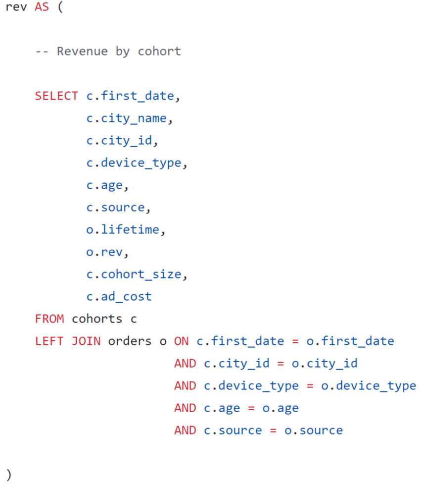 Revenue by cohort was calculated by joining two tables.