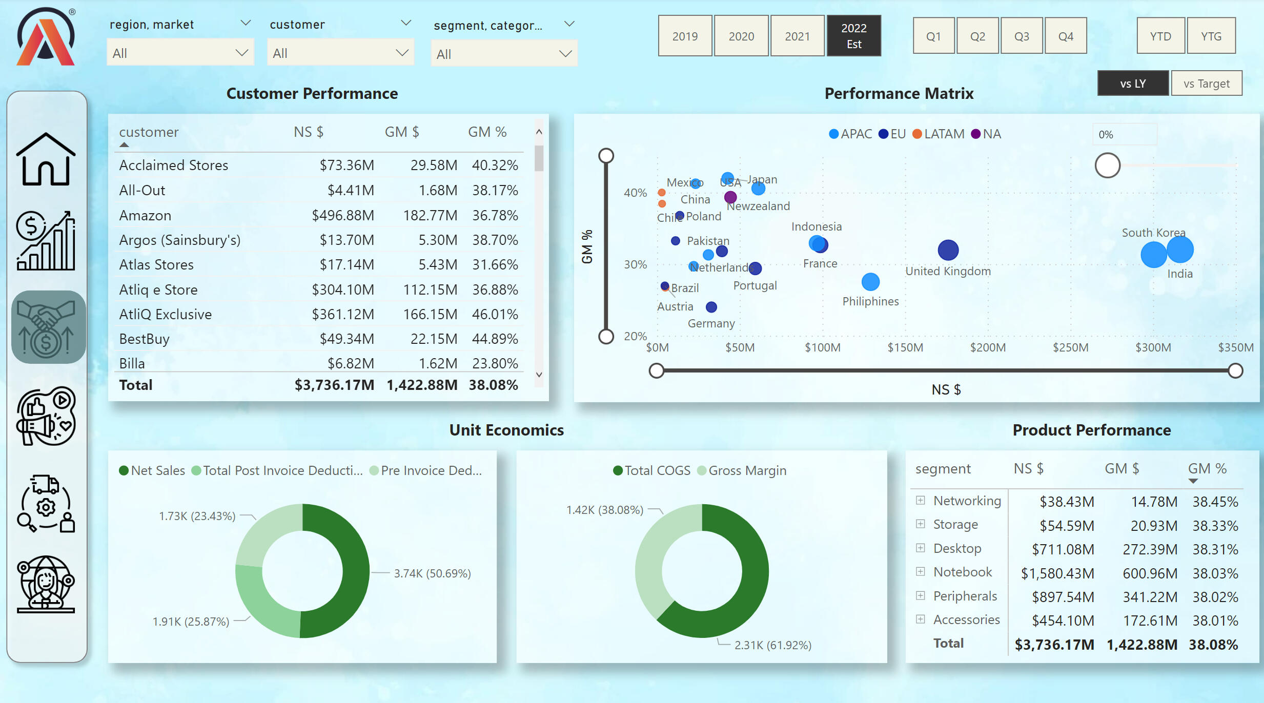 From the financial view we can see many key metrics. Also, the profit and loss statement for 4 years. We can choose the date by diffretn time stamps. On the line chart we can compare the sales data of this year and the previous year we can also see the most profitable products by category and county.