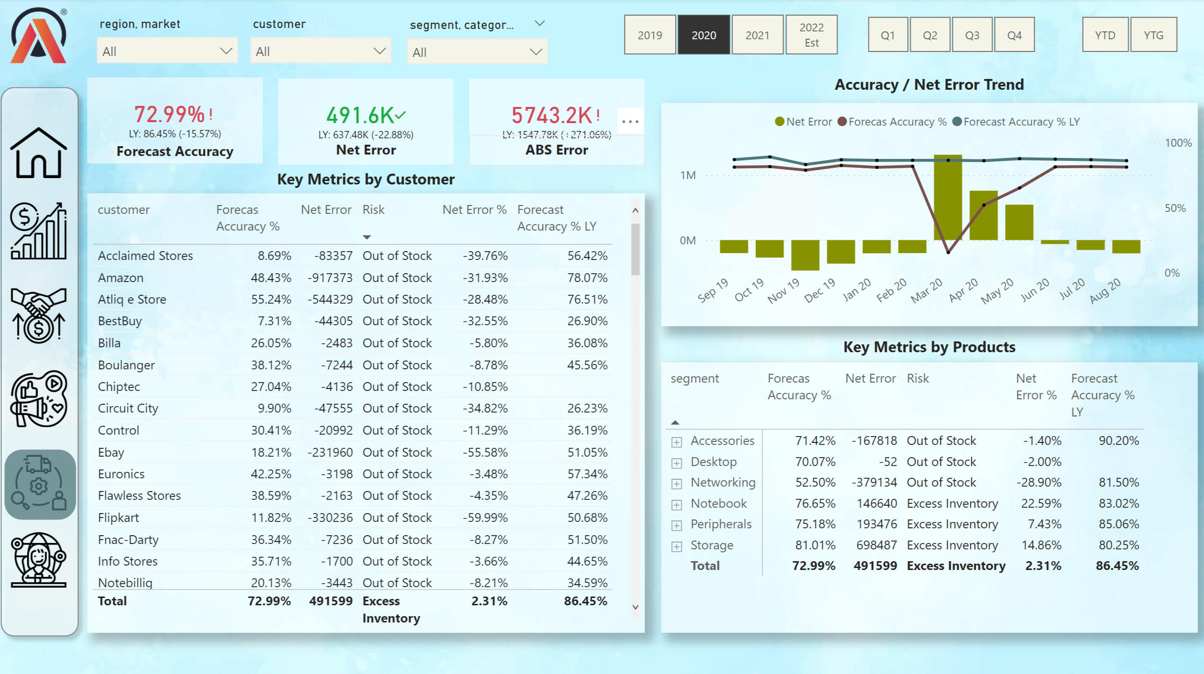 This view shows the key data for the shipping department. in the Tables, you can track the availability of goods, as well as the accuracy of the forecast.