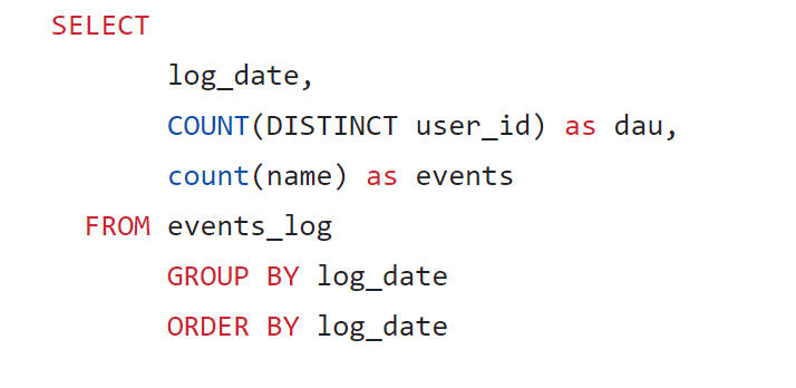Query to obtain DAU and count the number of analytical events per day.