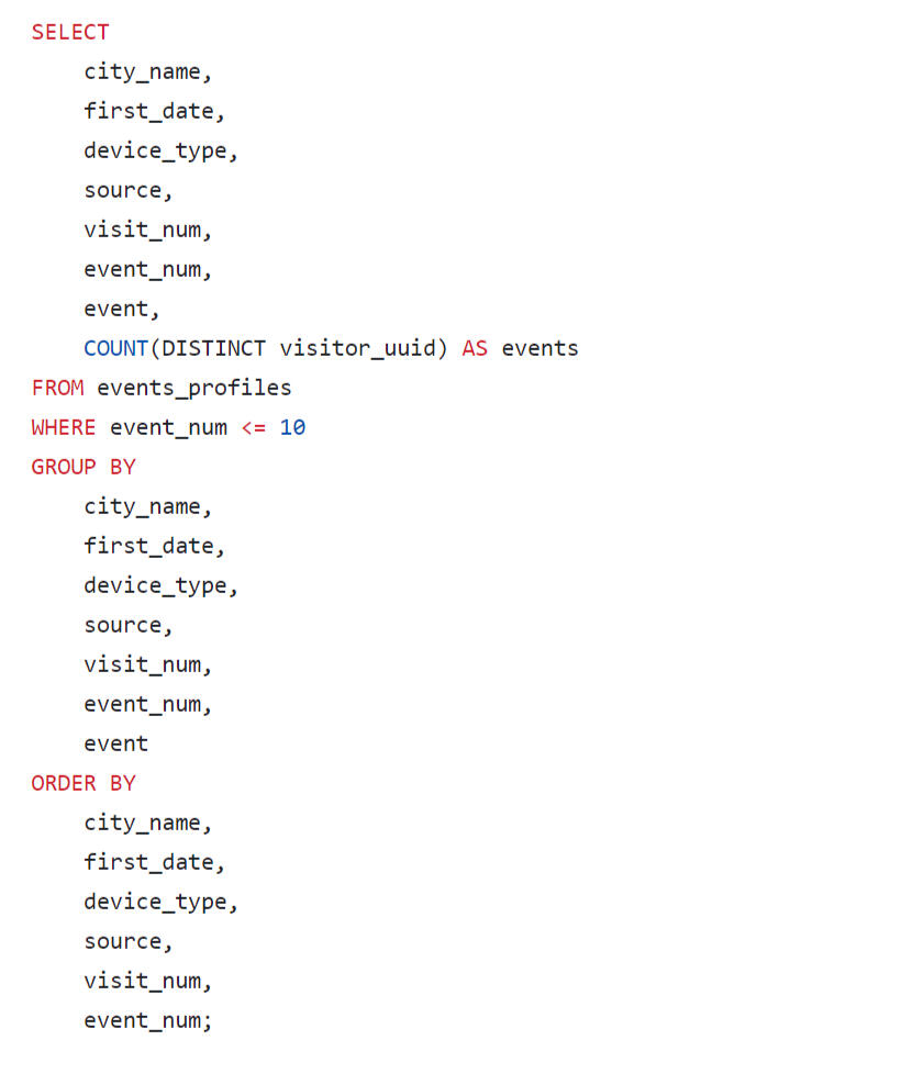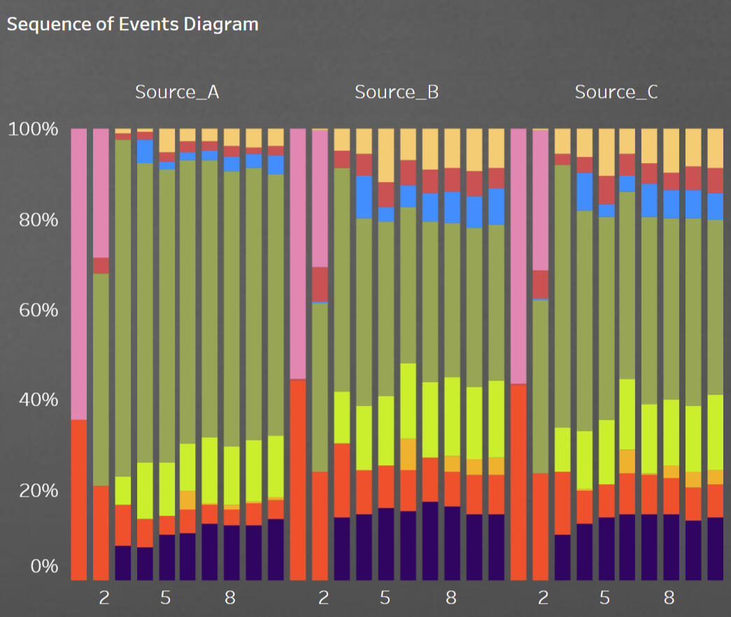 It is difficult to analyze the results of this query using the resulting table; this data is visualized using Tabelau on a diagram: "Sequence of Event Diagram"