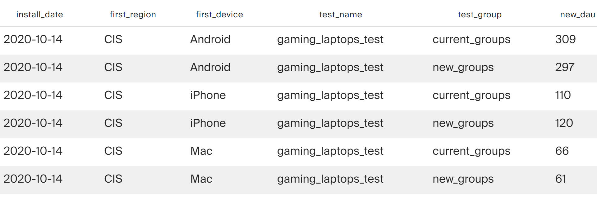 Table of distribution of test participants by days of recruitment, groups, devices and geographic regions.