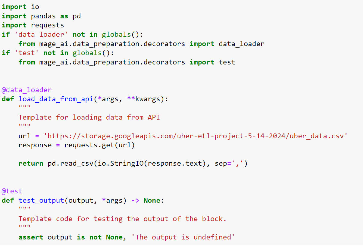This Python script fetches Uber New York data from an API URL and converts it into a Pandas DataFrame. It's optimized for integration into an ETL pipeline, ensuring smooth data loading. A built-in test function validates output reliability.