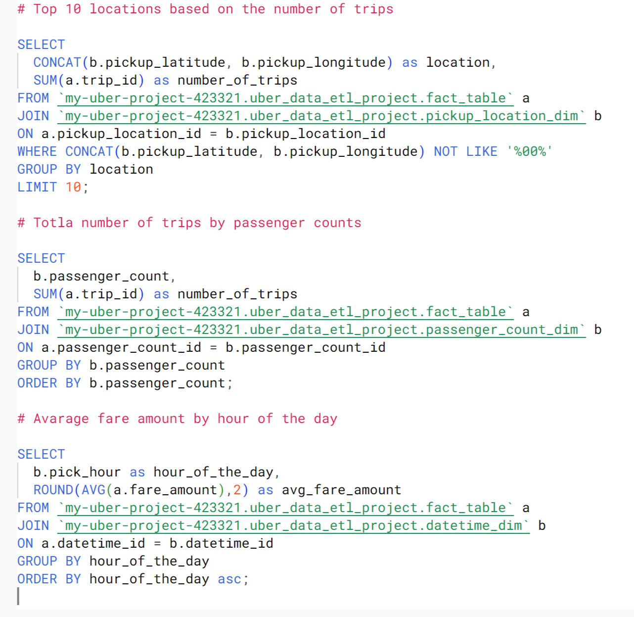 After conducting data analysis with BigQuery, I created a dedicated table for analytical purposes within Looker. The table, named tbl_analytics, integrates various dimensions and measures essential for in-depth analysis of Uber New York data. Leveraging JOIN operations, it combines data from the fact table and dimension tables, providing a comprehensive view of relevant attributes such as trip details, passenger information, payment types, and fare amounts. This structured table serves as a foundation for generating insightful visualizations and conducting advanced analytics within the Looker platform.