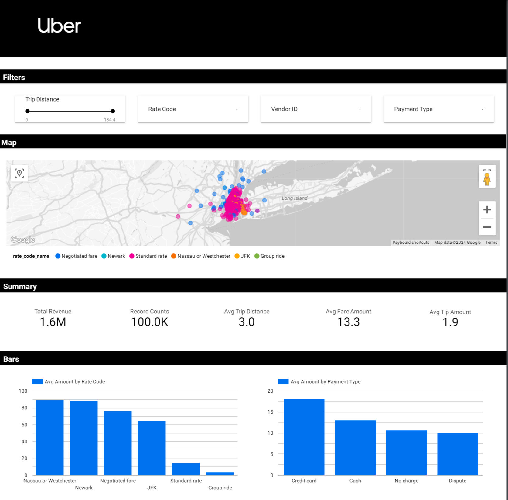 The visualization of the Uber New York data encompasses a range of interactive features and key performance indicators. A filter enables users to customize their analysis, while a map visualization depicts order locations categorized by vendor ID and zone. Crucial metrics such as total revenue ($1.6M), average tips ($1.9), record counts (100k), average trip distance (3.0), and average fare amount ($19.0) are prominently displayed. Two bar charts offer further insights: one showcasing average amounts by rate code, highlighting Nassau or Westchester as the most profitable ($90.0) and group rate as the least profitable (approximately $5.0), and another presenting average amounts by payment type, with credit card transactions leading ($21.0) and disputes trailing (around $10.0).