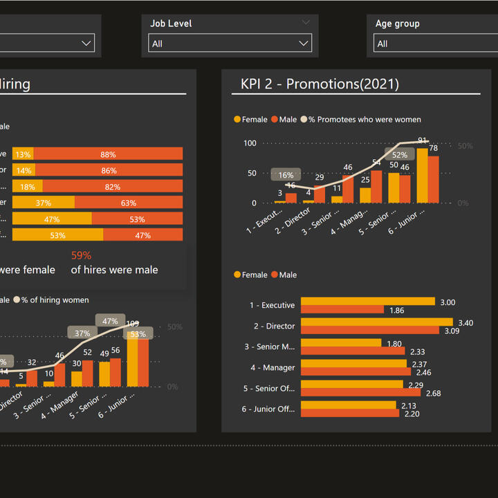 This view shows the key KPIs of the company's employees by gender, age, region, job level, and department in the company.