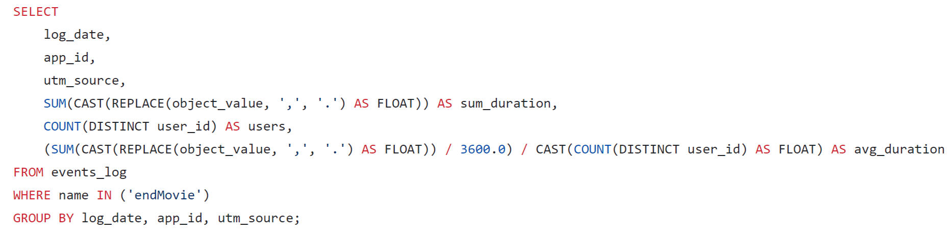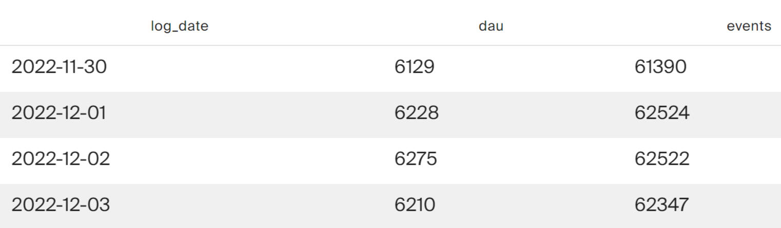 Query to obtain DAU and count the number of analytical events per day.