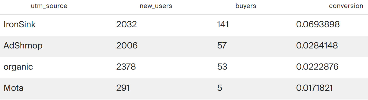 The previous query showed that Mota is an outsider in terms of the absolute number of attracted users. This channel is inferior to everyone except organic in terms of conversion. And the conversion leader is IronSink.