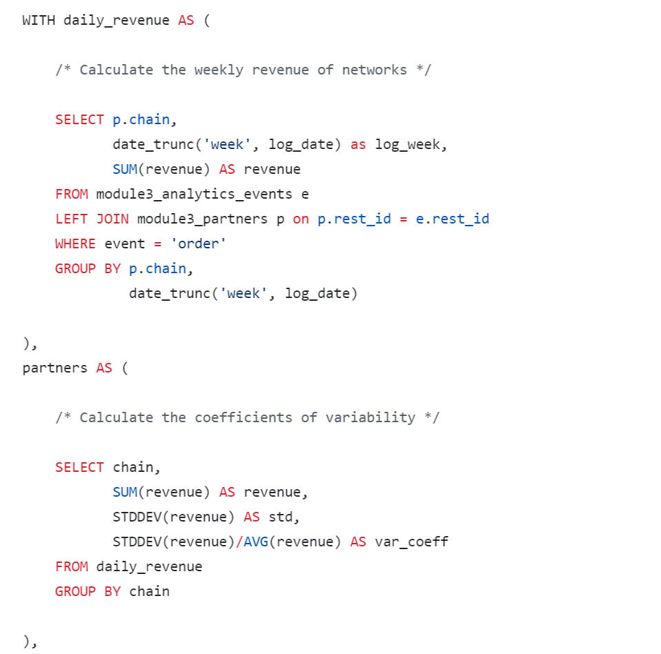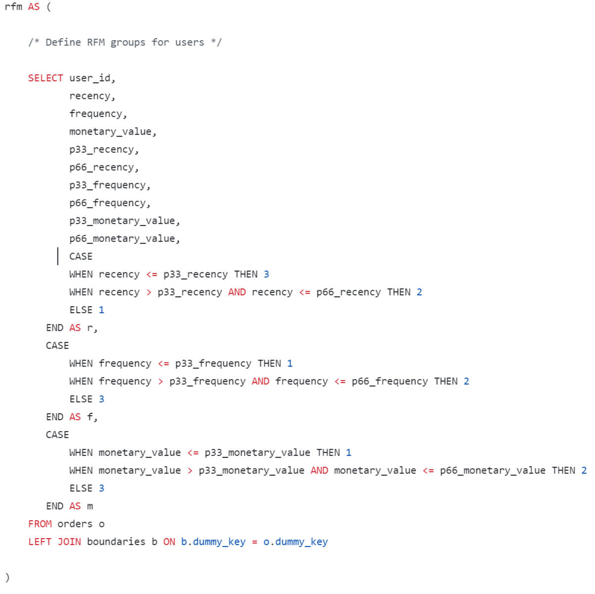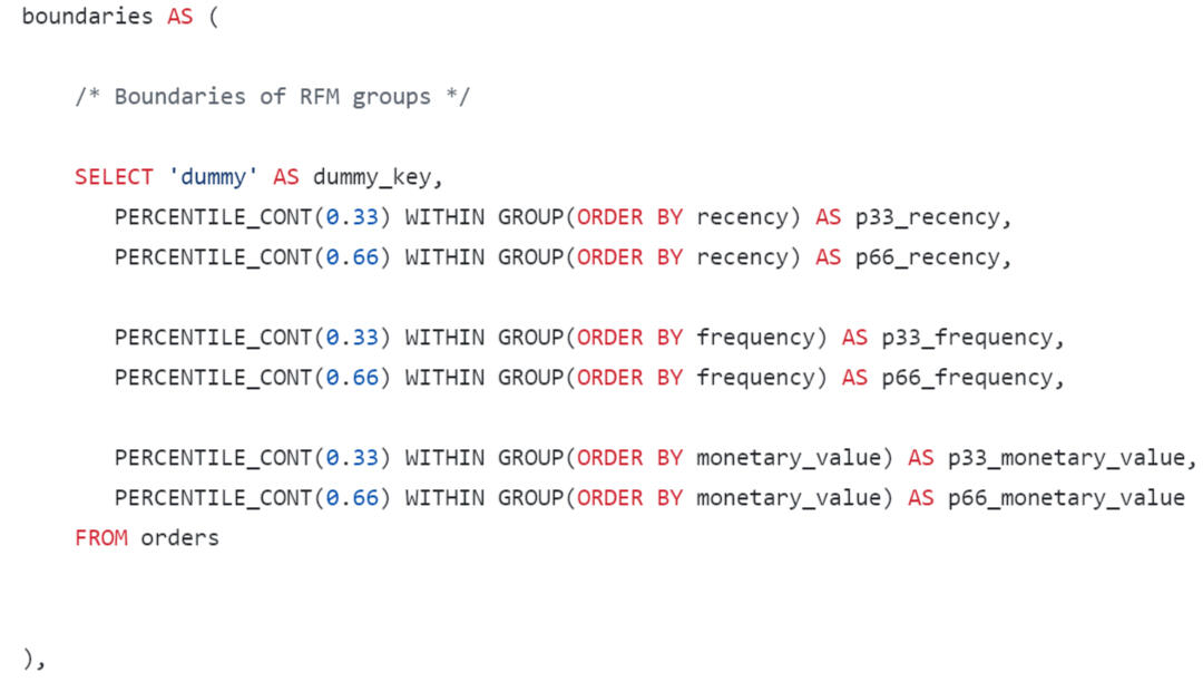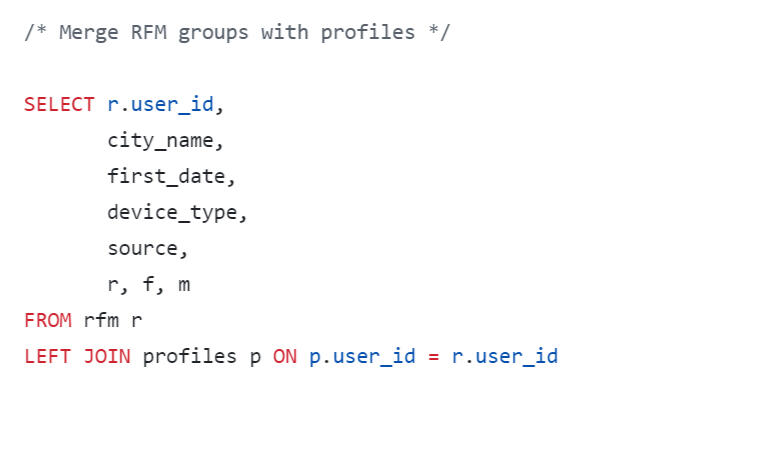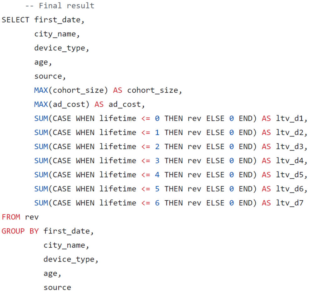 In the final query, we will format the output of the results in the form of a wide table, where we will sum up the LTV by lifetime segments.