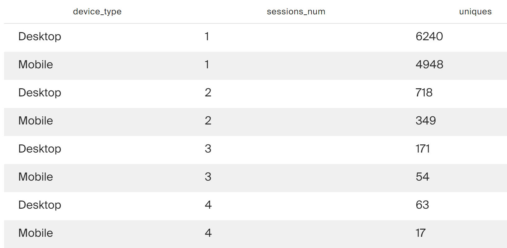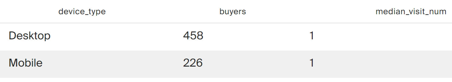 The query results show that on both platforms, purchases most often occur within the first session.