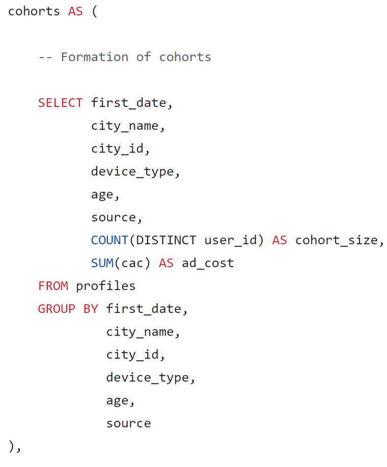 Cohorts were formed by date, city name, city id, device type, age group, source.