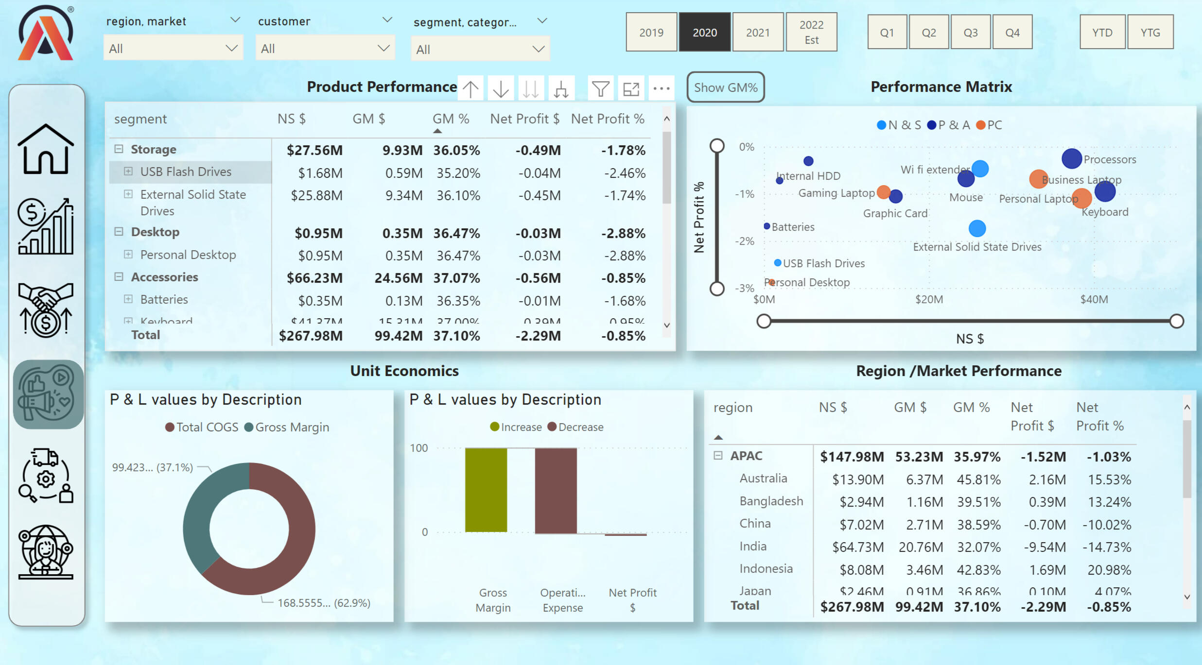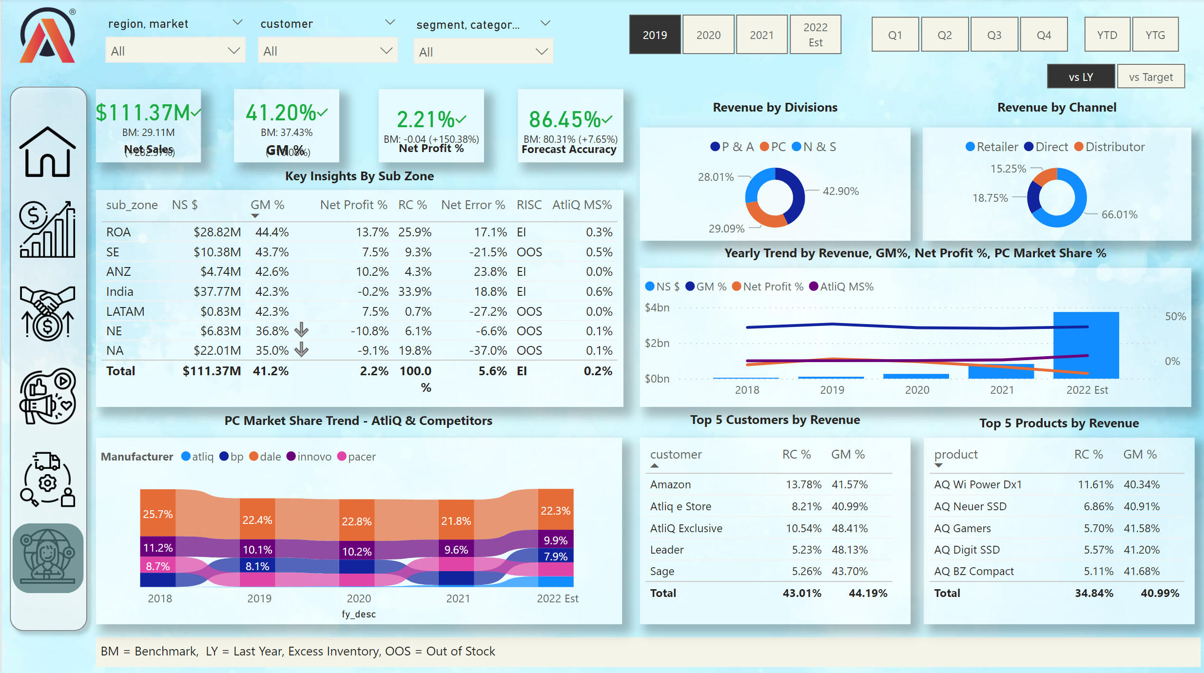 This view shows key values in different categories. On the Ribbon Chart, we can see the market share of key PC sellers between 2018 and 2022. We can also track the profit of the company according to various criteria.