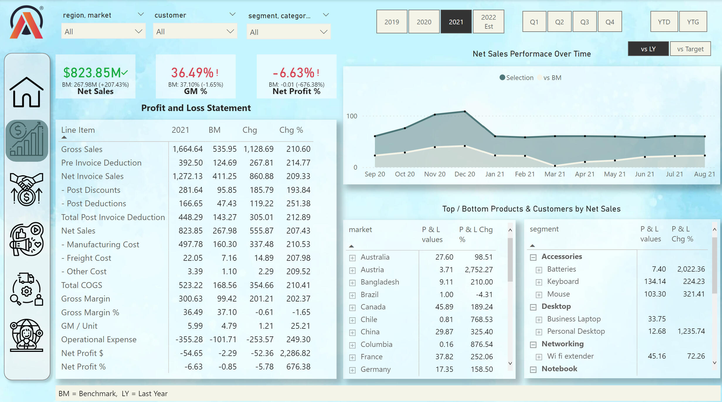 From the financial view we can see many key metrics. Also, the profit and loss statement for 4 years. We can choose the date by diffretn time stamps. On the line chart we can compare the sales data of this year and the previous year we can also see the most profitable products by category and county.