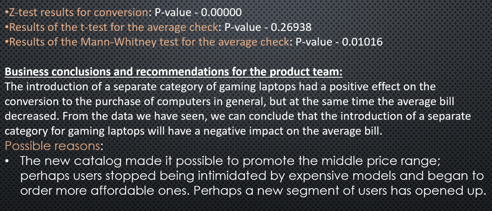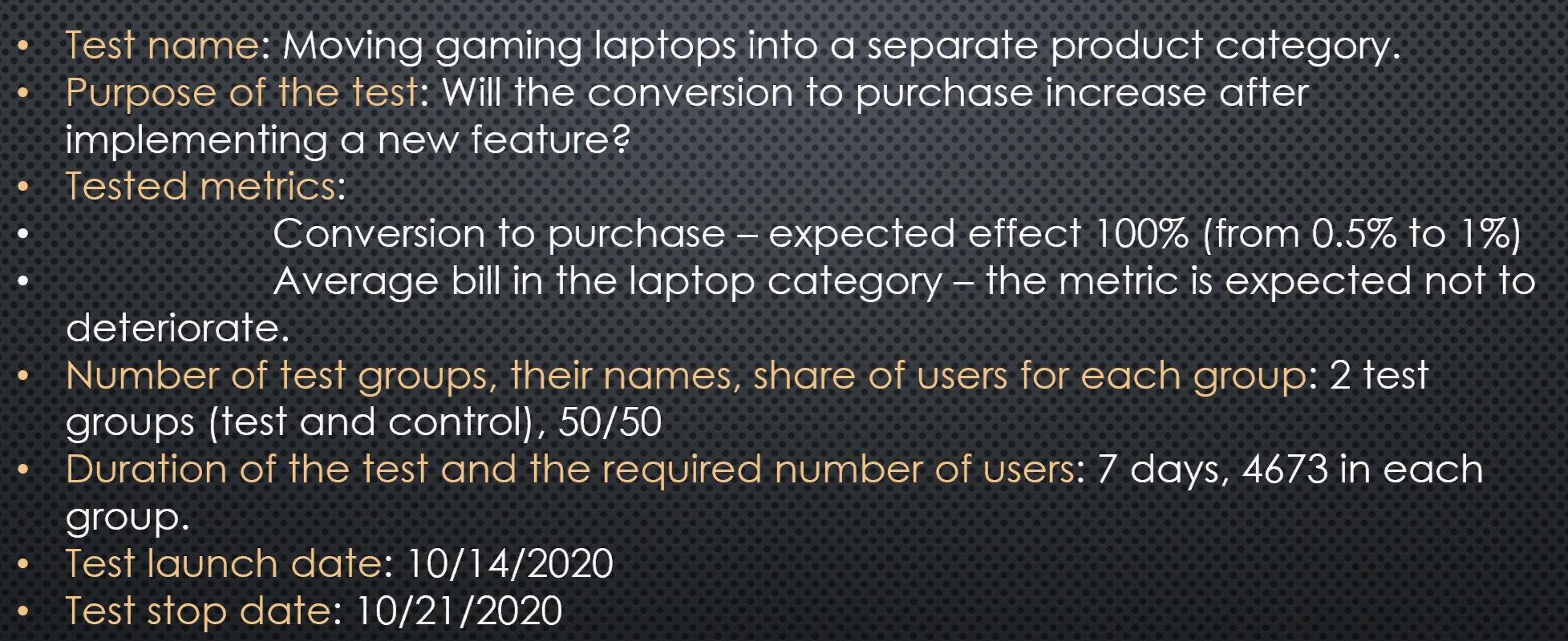 Conducting an A/B test to test the implementation of a new category on the site for gaming laptops.