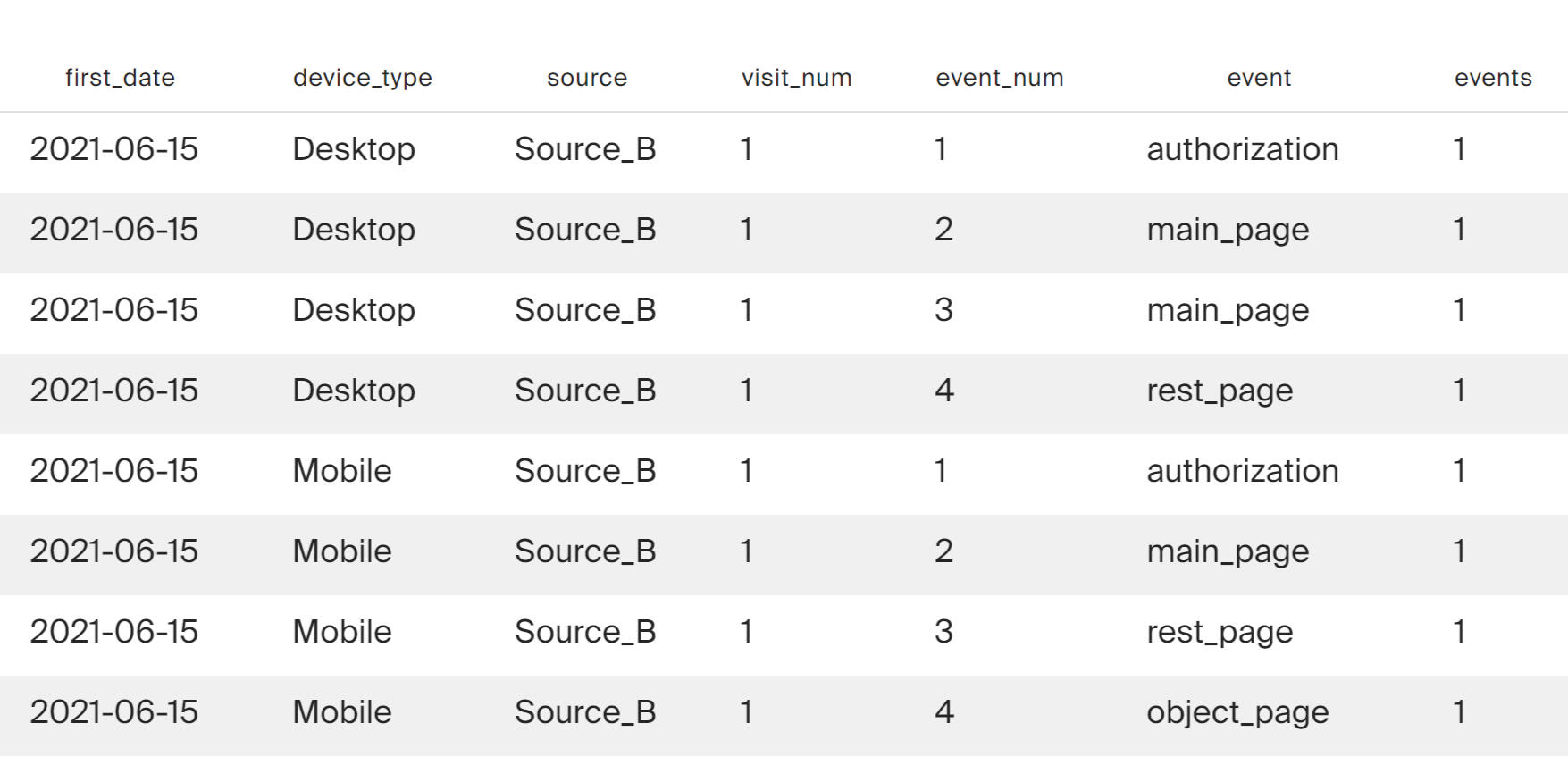 It is difficult to analyze the results of this query using the resulting table; this data is visualized using Tabelau on a diagram: "Sequence of Event Diagram"