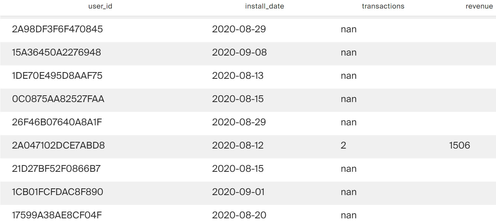 The query result shows that every day each of the channels - organic, IronSink and AdShmop - attracts about 30% of new users each. An outsider in attracting new users is the Mota advertising network.